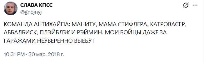 Че как думаете почему жопич с сасаем поругались? У меня два предположения 1. Слава сейчас в прайме, денег дохуя, но откладывает их на рождение бебика и куроме отдает. А сасай доедает хуй без соли в берлине, концертов нет, музыку не выпускает, сын проедает деньги, слава не хочет писаться вместе, он лучше с ог будой или принцем тусовать будет, денег от этого для своего бебика больше будет. Вот и поругались 2. Из-за полит позиций. Замай жестко против сво и муток россии, а жопич массивной жопой сидит на двух стульях, берет бабки от ИРИ, пишется с зетниками типо Зангези. Они еще пока Замай был в россии расходились в категоричности взгляда на сво. Плюс может у них был договорнячок что они оба съебут из страны, но по итогу жопич затерпел. Ну и сасай вон как с пукером мощно посрался, а жопич его на фит пригласил на альбом. Потому что с пукера сейчас тоже можно поиметь копеечку, он стал рукопожатным, а не кринжовой пиявкой. А с сасая ничего не поимеешь
