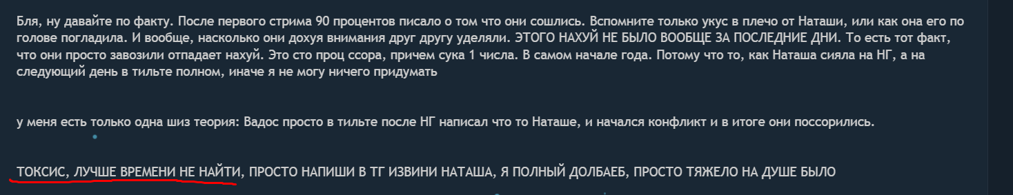 Бля, ну давайте по факту. После первого стрима 90 процентов писало о том что они сошлись. Вспомните только укус в плечо от Наташи, или как она его по голове погладила. И вообще, насколько они дохуя внимания друг другу уделяли. ЭТОГО НАХУЙ НЕ БЫЛО ВООБЩЕ ЗА ПОСЛЕДНИЕ ДНИ. То есть тот факт, что они просто завозили отпадает нахуй. Это сто проц ссора, причем сука 1 числа. В самом начале года. Потому что то, как Наташа сияла на НГ, а на следующий день в тильте полном, иначе я не могу ничего придумать