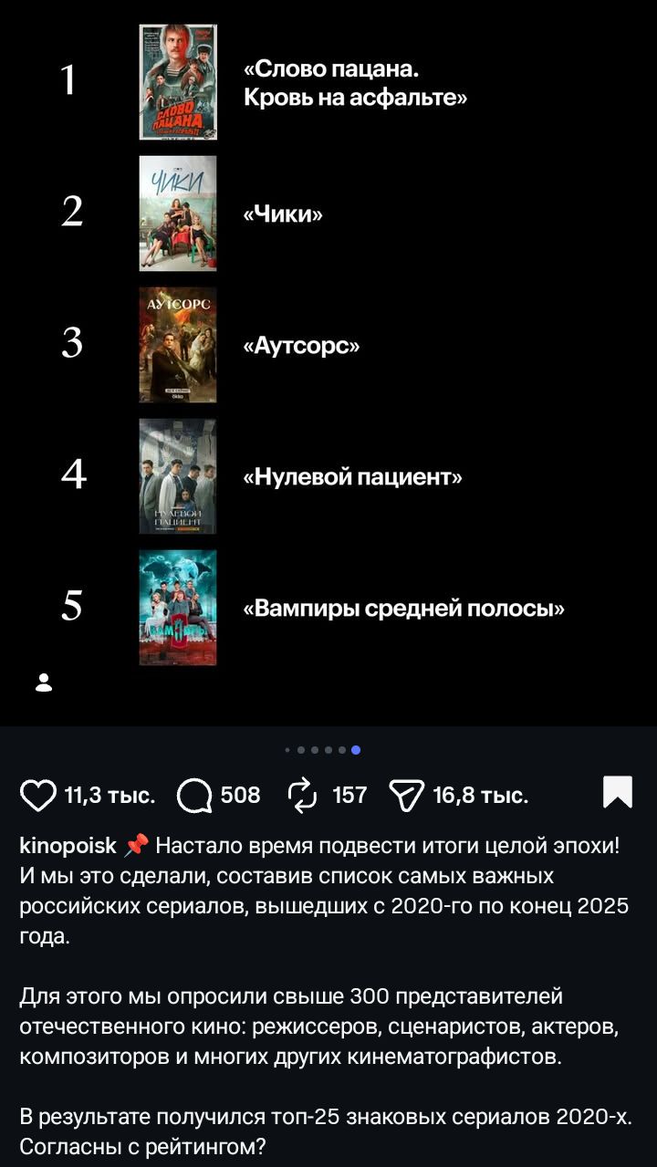 Привет. Намерено сократил своё пребывание здесь, не о чем было говорить, или не было того о чем можно говорить. Ждите 13 декабря, будет очень интересный анонс, угар плотный поймаете. Возможно, после этого поменяется слог, будет меньше провокаций. Второе - ахуел недавно с киноблогеров. Они делают подборки лучших сериалов за 2025й год, утверждая что это выбор критиков. Ни в одном из этих топов нет «Путешествие на солнце и обратно». Знаете почему? Потому что они пиздят и эти подборки куплены. Путешествие - сильнейшая работа за последние несколько лет в русском кино, но он не в индустрии. Кто до сих пор не посмотрел - исправляйтесь. Третье. Видимо, на время перестану быть поваром. Не успеваю делать сторонние проекты, пропал интерес к той кухне на которой работаю, видимо, потому что уже все знаю и это превратилось в рутину. Не могу честно выполнять одно и тоже, при этом подставлять коллег из-за графика съёмок. Выводы: в декабре буду делать творческий движ, вернем стримы, сделаю наконец ипишку чтобы вам было покушать. Четвертое. Берегите здоровье, холодно чето болеют все, а вы не болейте, потому что мы - андер. А Андер - против всех. Обнял