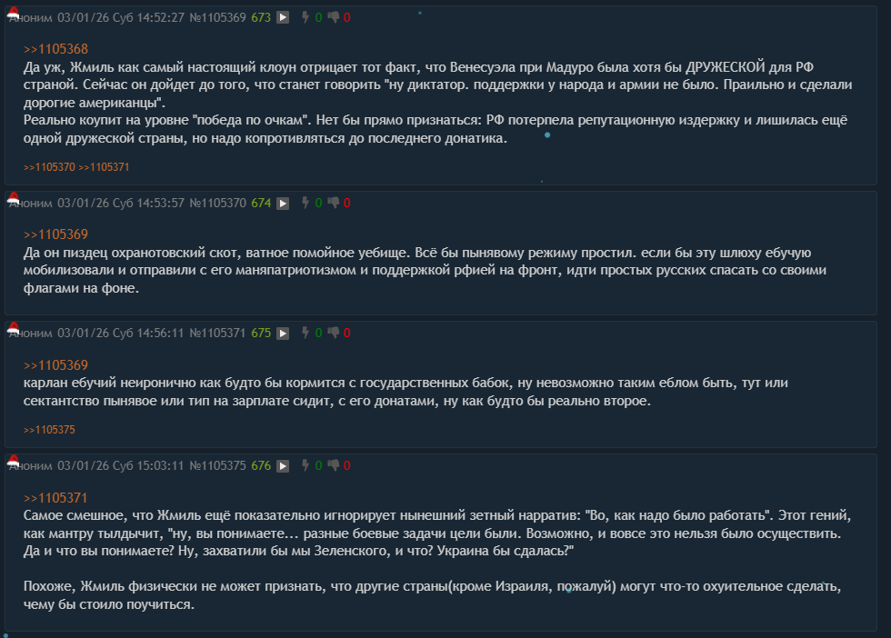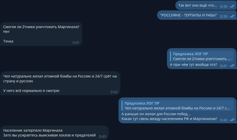 И фича в том, что Маргинал может безнаказанно годами поливать их помоями, говном, грязью, смешивать всех русским с нечистотами, и поцреотам....нормально, им заебись же. Жмилю тоже заебись, Сармату, который это всё обсуждает тоже заебись.