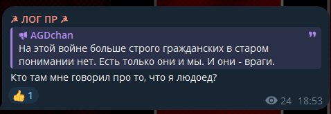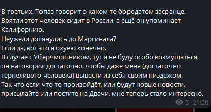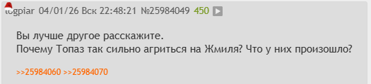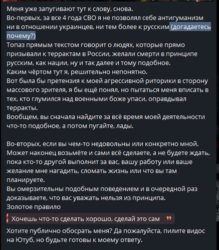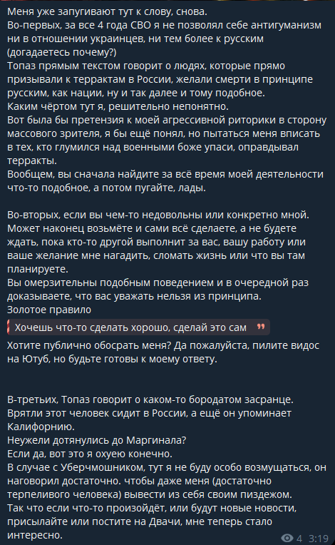 Ну пост интересный, потому что в /hry/ запостили речь про бородача, за которым охотится Топаз. Во-вторых, я на любую угрозу или запугивание реагирую. Но было бы похуй, если бы....речь не была про военных, издевательства над смертями, антигуманизм и прочее. Меня давно в укрофашистов записали и пытаются всячески приписать, что я якобы против добрых русских людей и прочую подобную хуету