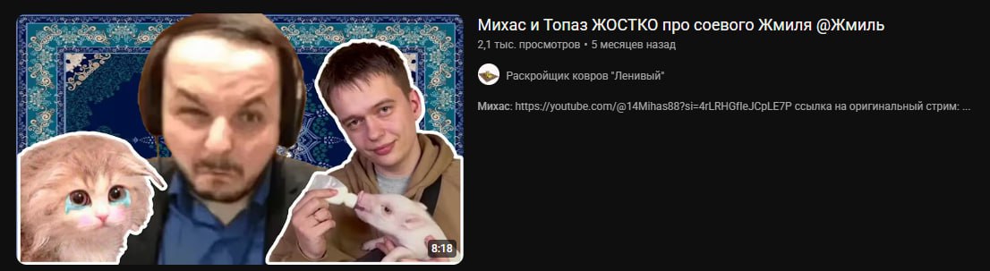 > Почему Топаз так сильно агриться на Жмиля? Что у них произошло? > Смотришь его стрим со Жмилем, потом с Михасом потом с Андерболом. У тебя все нормально? Я написал послушай совместный стрим Жмиля и Топаза https://youtu.be/VzHpsPovT7c?si=YLLOrj3ph2qXVpCU После этого стрим Топаза и Михаса https://www.youtube.com/live/XY7AN7cu8A8?si=SCmDe6H5ZTDiT-_b И только потом стрим с Андерболом, там на пальцах Топаз объясняет что он думает про Жмиля Ты какие стримы смотрел вообще?