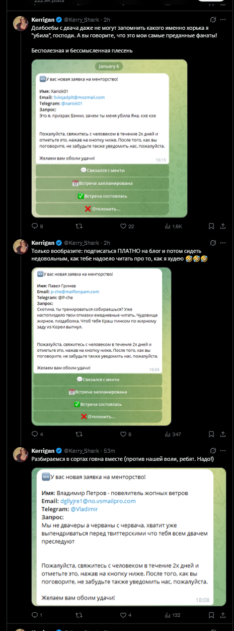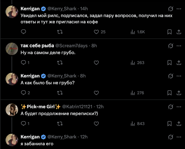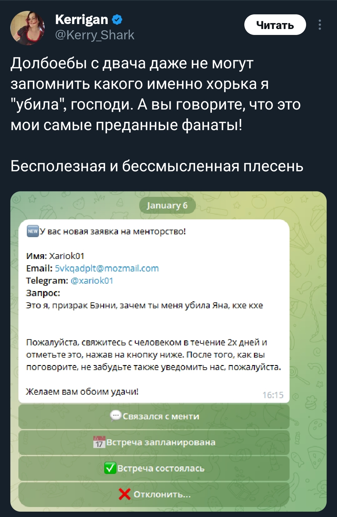 >>25995454 А, я понял. Походу это "ПОКАЗАТЕЛЬНОЕ ПОСЫЛАНИЕ" только для краша продемонтстрировать, что она только его. А он, кста, тут сидит. Привет тебе, Дениска!