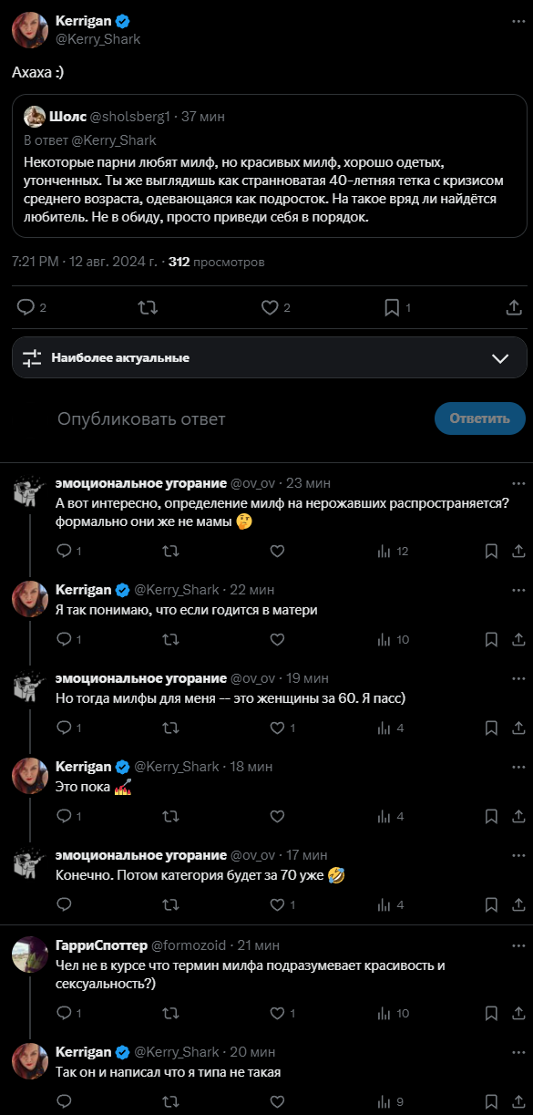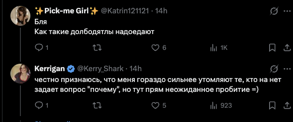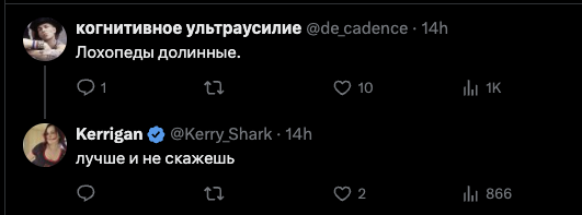 >>25986955 Вот эту читал в Твиттере. Типичная соя, матерится почти в каждом предложении, кукуха едет, в общем, золотой соевый стандарт. Внешность обманчива.