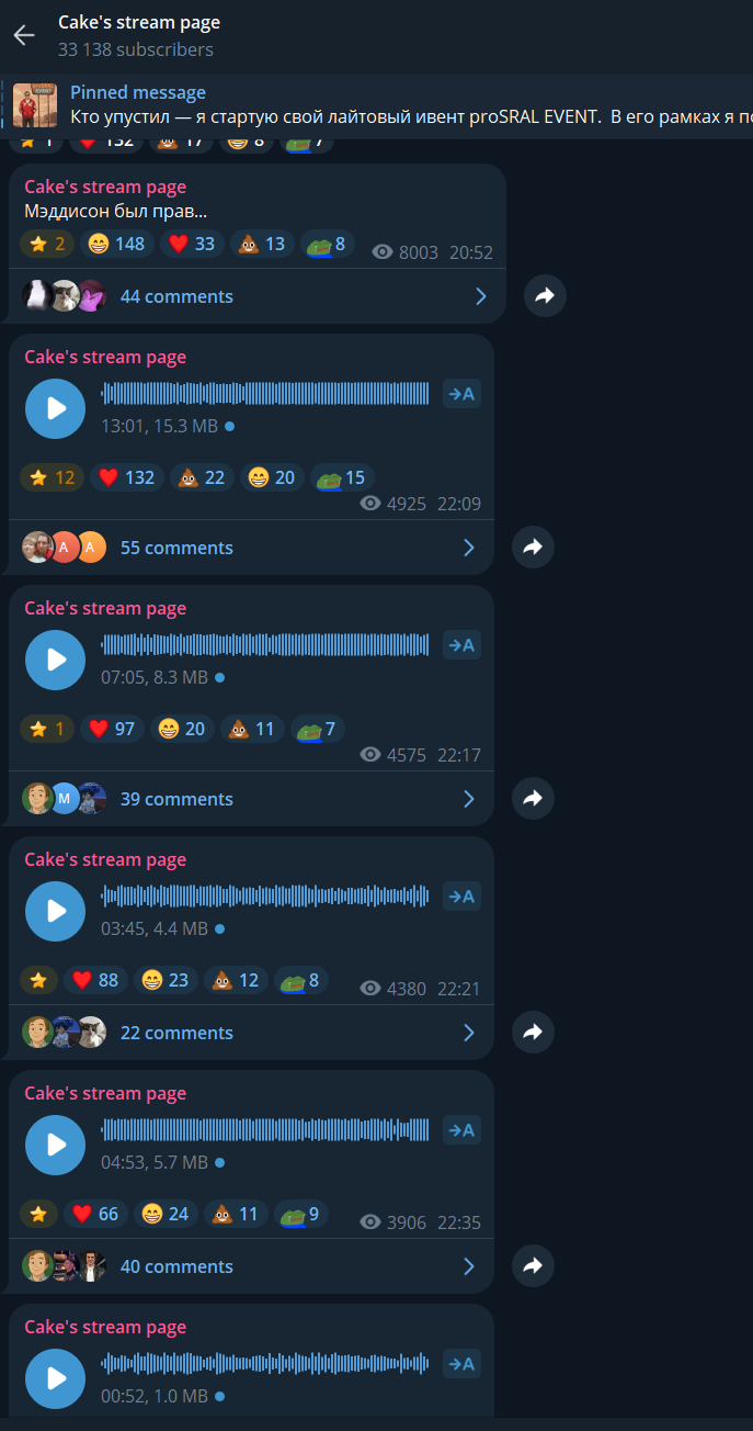 >>26001889 у кейка в тг сидят 30-40 комментов в среднем, кому он пиздит что он не крутит. У этих стримакой долбоёбов вообще за 10 лет стримов из головы извилины пропали? Они понимают, что такое 2-3к тысячи человек, как это много блять, это не просто цифра в счётчике? В на его тг 33 тысячи человек подписано и 30 комментов в среднем
