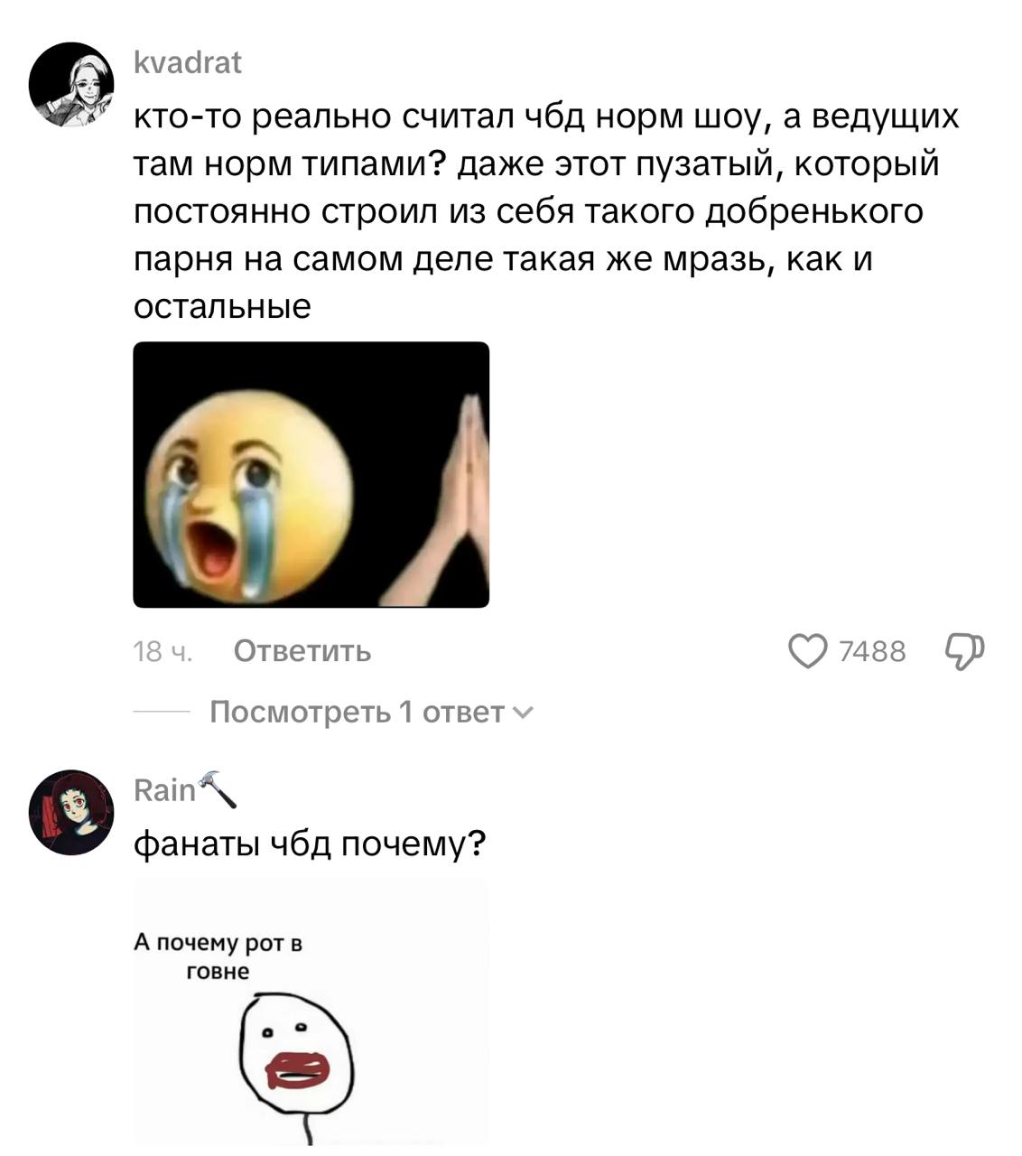 После своей истории Руслан захотел раздать каждому комику по футболке, а в ответ они их раскидали по залу, только Эмир Кашоков не стал этого делать. «ЧБД» в очередной раз захейтили, а артист многим понравился из-за своей доброты.