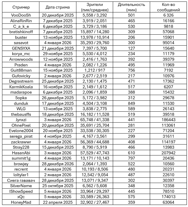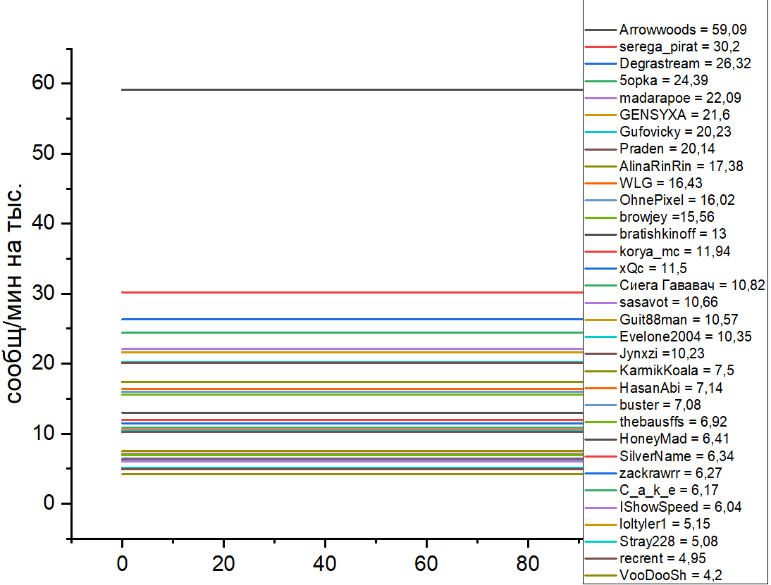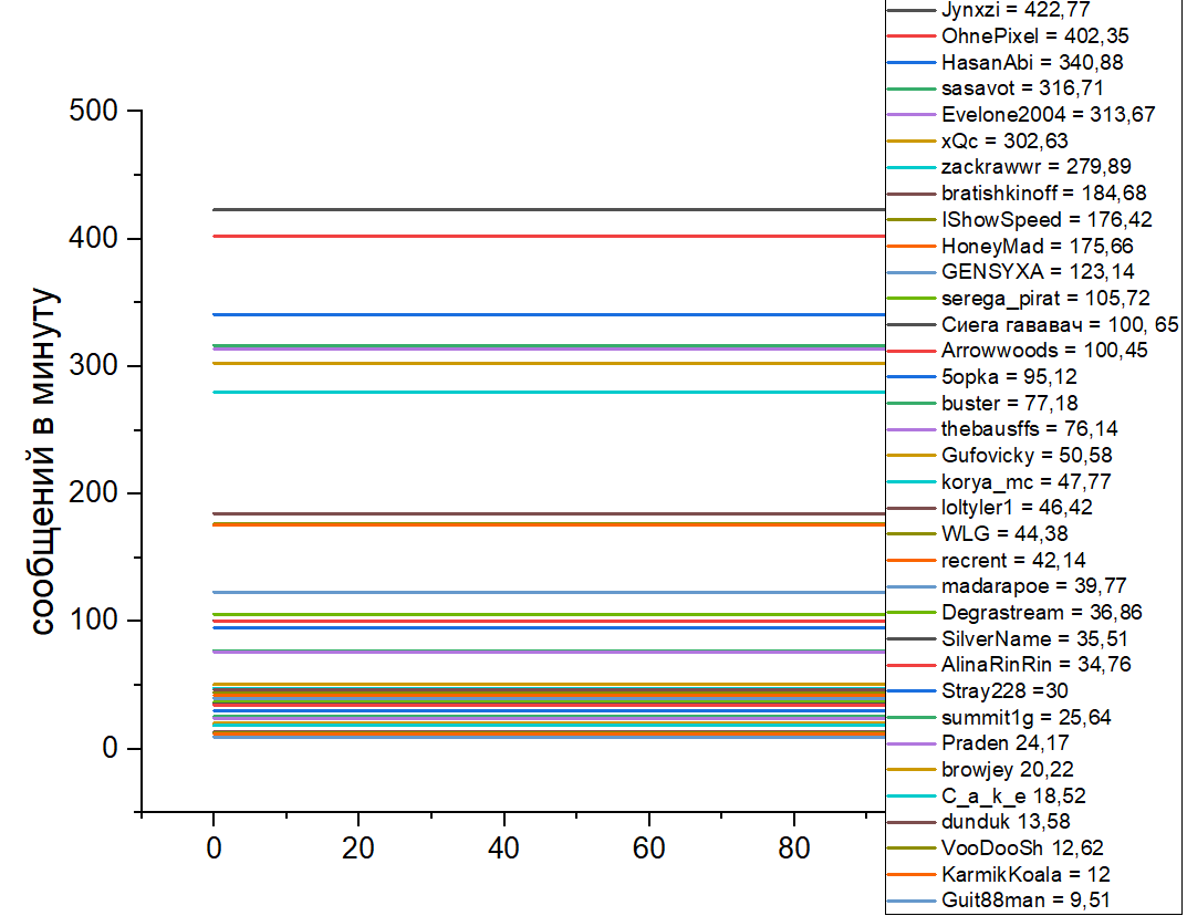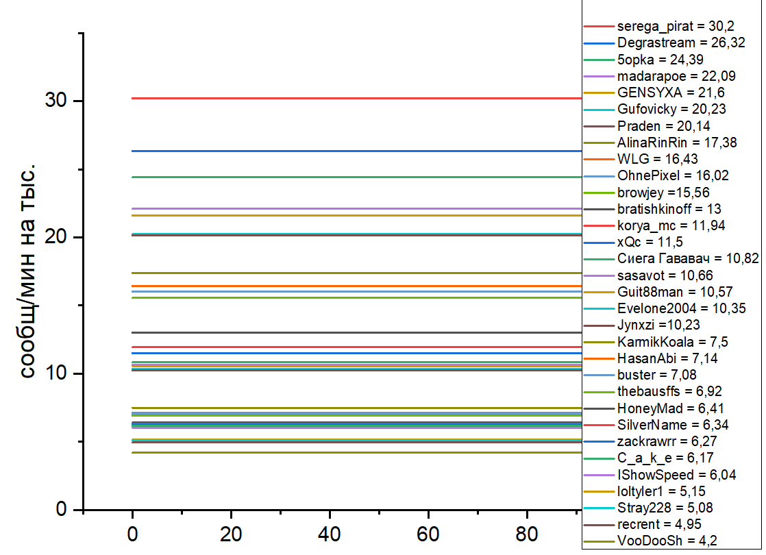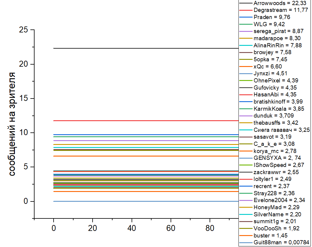 >>26002079 Да никакова. Выборка маленькая, перепроверял у дяди Г, если взять насраловский стрим то на тысячу уже 20, а у Генсухи если взять стрим с большим онлайном (чето про дубай) - уже в районе 6. Вот все что было. Логи чата брались с twitch chat downloader, статистика по зрителям с twitch racker