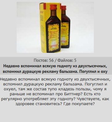 >>26002488 Это фейк. Явная подделка для детей, которые настоящего биттнера не застали. Я точно помню "просто биттнер", и там ещё старичок такой. И вкус сладковатый, как у шиповника. Тысячу раз это было, перепутать невозможно.