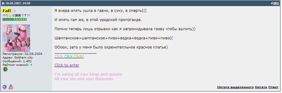 >>26003064 Есть скрины со скейтерского форума за 2005-2007 года примерно она там писала и о наркотик в том числе по вене пулялась и о ебле любила ебатся каждый день ну или раз в три дня хотя бы ей там от 15 до 17 лет примерно