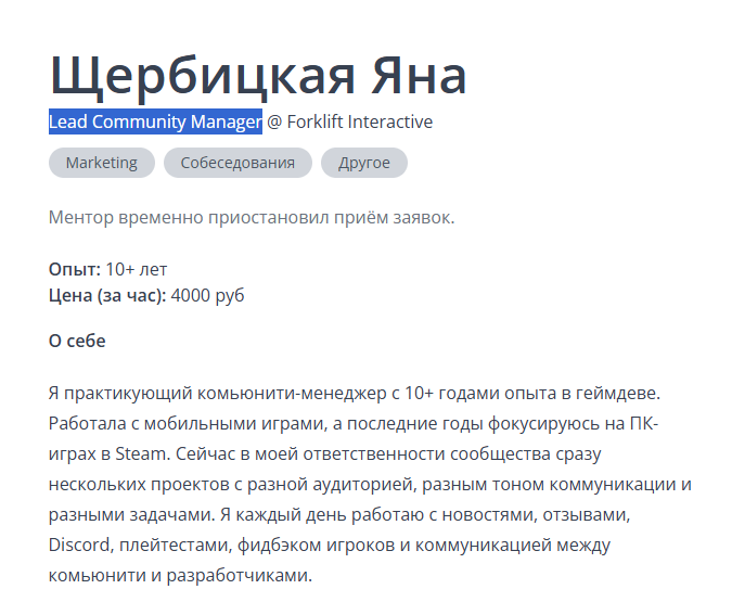 С какими уровнями работаю: Junior и Middle комьюнити-менеджеры, специалисты без формального опыта, а также небольшие команды и инди-студии, которым нужна практическая помощь с комьюнити и коммуникацией.