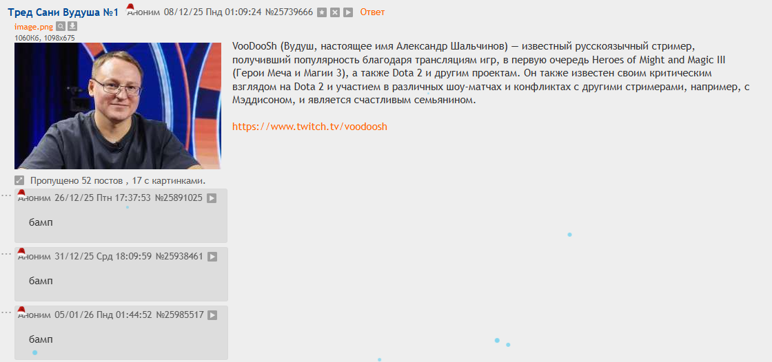 >>26011678 что написали в методичке и тз, то и повторяют, сказали упоминать, что он пожарник и что харизма у него есть, вот и повторяют, жаль сложнее будет найти момент, где она на стриме его начинала рекламить, начав фразу "а видели на твиче стример появился прикольный сасавот, не видели?" и чат такой КТО БЛЯ? это такой сука сюр, пока там кека воюет со своим кукой, тут сасалврот сидит скупает рекламу у стримеров и в хуй не дует, накручивая ботов