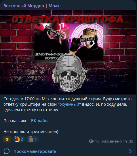 А насчёт пиара. Блять, посмотри сколько набрали подкасты с Норвудом и Ретрофором. Там по 3к просмотров. Это заказывали даже ВЕЛИКОМУ ЖМИЛЮ! И хули? У меня как было 200 подписчиков в ТГК, так и остаётся. На канале всё также меньше 1000 подписоты.