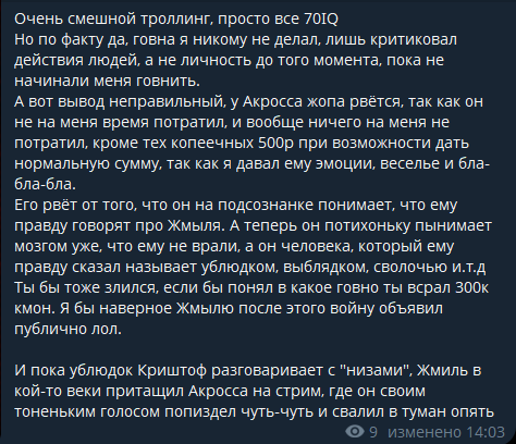 >Смотришь его стрим со Жмилем, потом с Михасом потом с Андерболом. Криштоф, ты забыл послушать стрим Жмиля со Жмилем. Ты ведь именно это должен был сделать исходя из своей логики