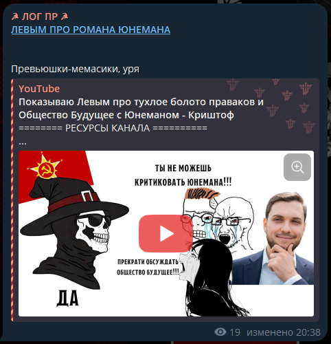 Коммунисты воспринимают работу на Ютубе ВНЕЗАПНО, как труд А у нас все почему-то хотят, чтобы ты пахал за идею, одновременно с этим тебя засирают, оскорбляют и хуесосят И НЕ ДАЙ БОГ ты возмутишься. тебя запишут в коммунисты и выпишут из русских