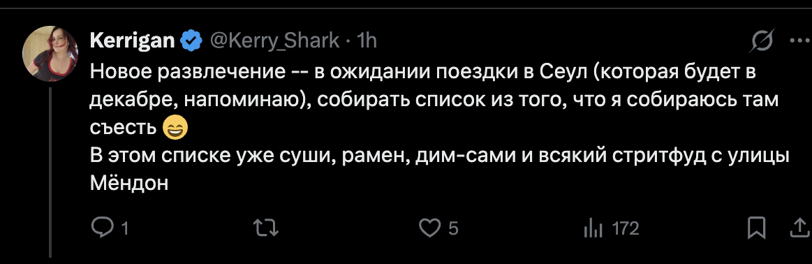 Я бы хотел. Мы бы гуляли с толстой Керри по Сеулу, ели лапшу и я бы слушал ее бубнеж про то какие все кругом мудаки, Как ей подговнил краш и как ее пытался выкурить из подвала сосед и что вижу плохо снимает видео и что мальвина ее уже заебала.