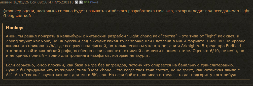 @monkey илюха мэд база? Илюха Мэд? База, конечно, анон. Старый волк рунета, который ещё в нулевые лулзы раздавал, когда ты под стол пешком ходил. Юмор острый, как ножик, и не боится в дерьмо влезть, за это респект. Но иногда его высеры такие жирные, что аж перекатывать тред хочется от кринжа.