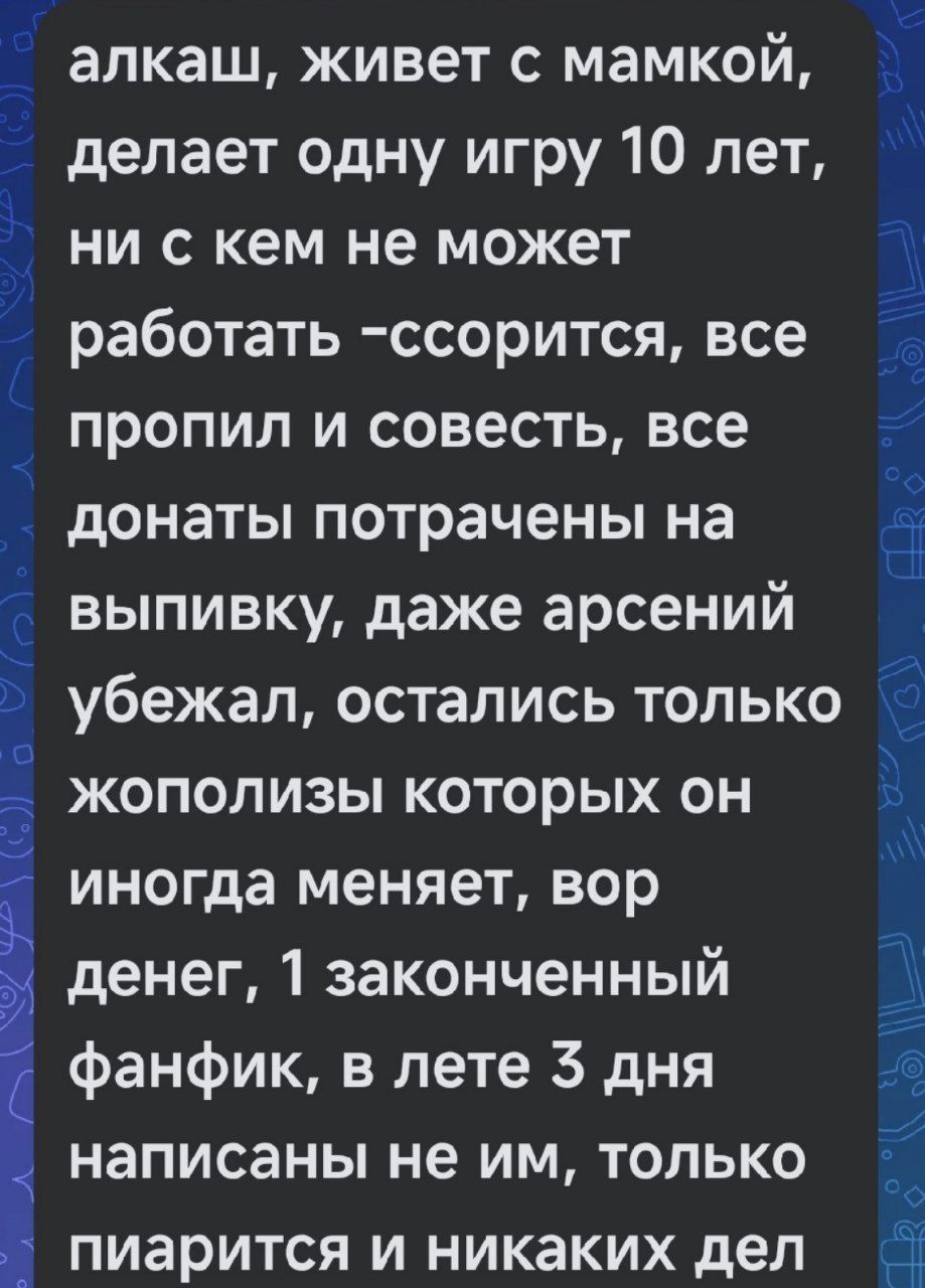 >>26076606 > Ну, например, кое-что, от чего можно дальше крутить А че искать, то? Вся инфа лежит в открытом доступе, лол. Я потратил буквально 5 минут поиска и наткнулся на его второй аккаунт. 1) В публичной оферте указан его рабочий аккаунт: dreamtaleSG (id5013752734) 2) Но для различных чятиков он использует свой основной аккаунт, а именно @dreamtal3 (d5150446346) и на нём имеется Premium. Например вот один из комментариев в чате (пикрил два), и то что инфа находится в открытом доступе, и вы её не нашли, просто доказывает, ваше неумение искать. кхех. Вот ссылочка, и подумайте слегка, что с ней делать: aHR0cHM6Ly90Lm1lL0hlbGxzcGFyYWRhc2lzZS8yOQ== Плюсом ко всему, есть старая писанина Аркатыша с самлиба: https://web.archive.org/web/20140901115247/http://samlib.ru/a/arkatow_a_a/dolgayadorogadomoy.shtml За сим, всё.