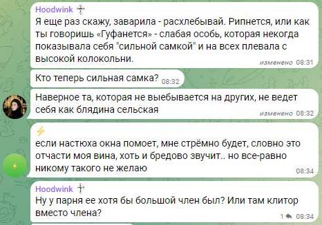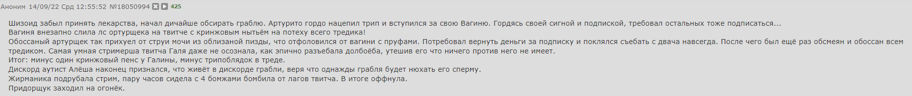 >>26122125 Смотри. Слонке не повезло в генетическую лотерею. Внешка трапа. Бывает. Она тупая. Бывает. Моральные качества ниже плинтуса (лгунья, завидующая, злая, злопамятная, жестокая, без чувства эмпатии). Бывает. Но комбо уже такое себе. И вот, с такими характеристиками, вместо того, чтобы забиться в ирл жизнь с куном, работать на гречневой работе она обличает других, а сама «хороший человек». Как она еще в каринотреде быстла на карину, даже какого-то хрена левый стрим той спалила и гордо пошла хвалиться этим. Анон помнит эти ее кринжовые откровения про зависть к сестре, что она должна быть в ее теле с ее ппрнем. Эти бесконечные войны. Как она бедную Кононву преследовала, треды с ней пилила. Потом на Димона бычила. Деанон Труси. Кринжовые наезды на трахова и Лизку. Ну и конечно Настя. Помню она еще в 2020 в ее конфу залезла, кринжово иностранного поклонника отыгрывала, в модеры пролезла. Асе эта ее мразотная привычка всех контролировать, в каждой бочке затычка, быть в центре скандалов, срачей и сплетен, но при этом до талого гнать, сто она не такая, она не кого трогает, не за кем не следит, не кому не срет втихаря. Это ханжество.