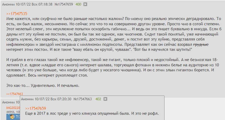 Наблюдать пожар чмарика со старого попуска Габи - бесценно. Проигрываю каждый раз как в первый, годами одно и то же и про голос, и про зеркальные предъявы в ее сторону.