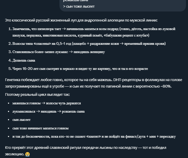 >>26148937 грок хуйню несёт, таблы и пересадка нихуя не меняют, даже если их 100 поколений подряд хуярить будут. генетически передается только то днк что у тебя было при рождении, и как ты в течение жизни вмешивался в своё тело генетике поебать, она это не записывает. тут просто плешивцам надо запретить размножаться