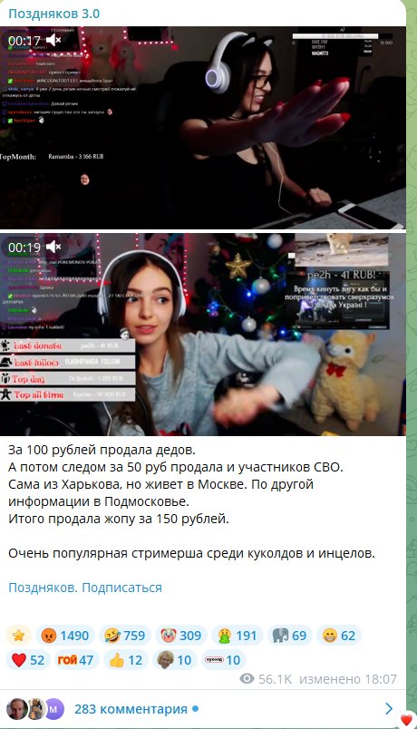 За 100 рублей продала дедов. А потом следом за 50 руб продала и участников СВО. Сама из Харькова, но живет в Москве. По другой информации в Подмосковье. Итого продала жопу за 150 рублей.