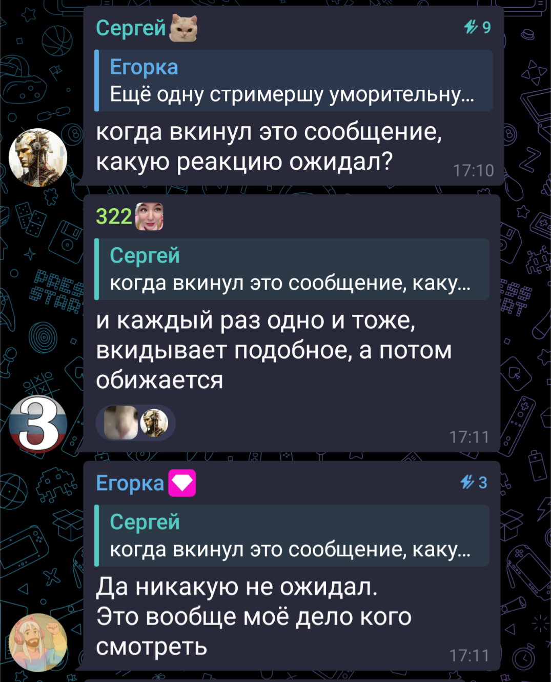 обстановка в треде пиздецовая конечно, одни и те же отбросы каждый день с утра до вечера занюхивают за успешным стримером и яростно надрачивают на богатого бывшего? симпа, что с вами не так блять, когда вы успокоитесь