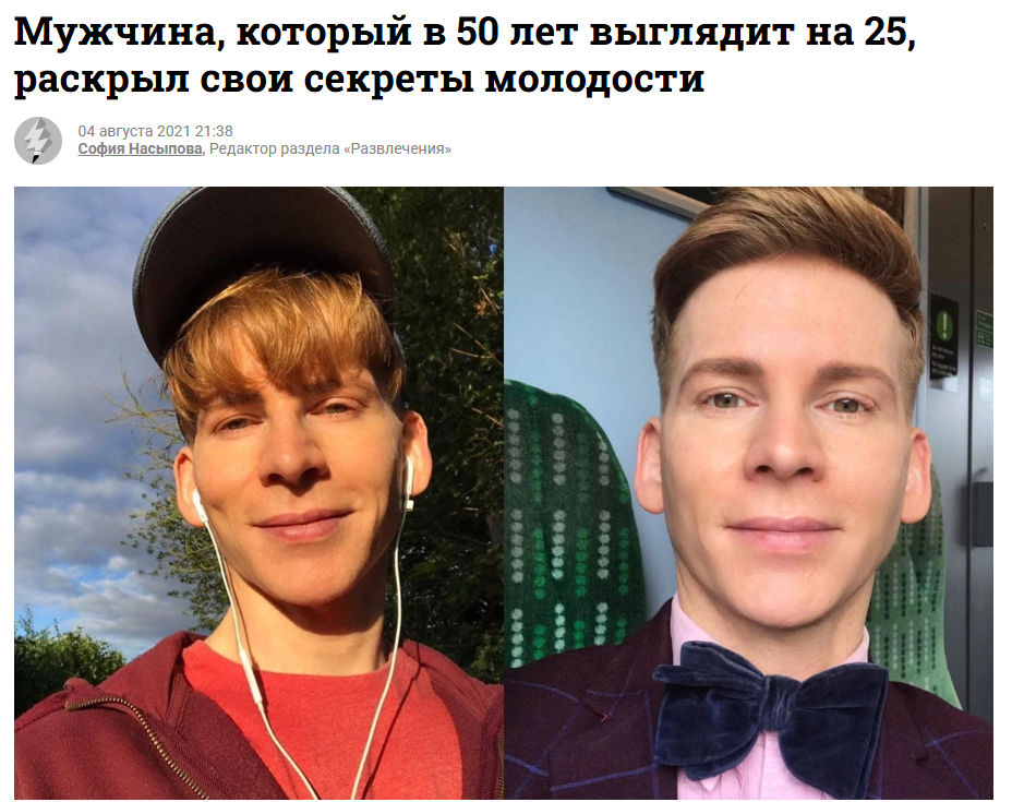 >>26145245 >Он один такой Он не один такой, дофига их. И не только знаменитости, так и в обычный жизни много таких. Любой кто не имеет скуфогенетики, не болеет, не бухает, не лысеет, не работает, не семьянин и не ретроградствует может выглядеть значительно моложе своих лет. > Или феномен или приписал себе 20 лет для хайпа. Нихуя он не приписал. Он моделью работает с ранних лет, есть его фотки из 1980.