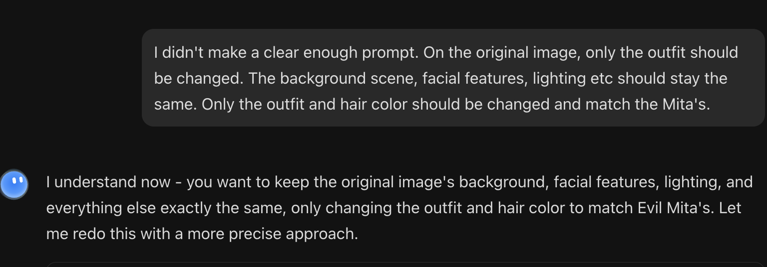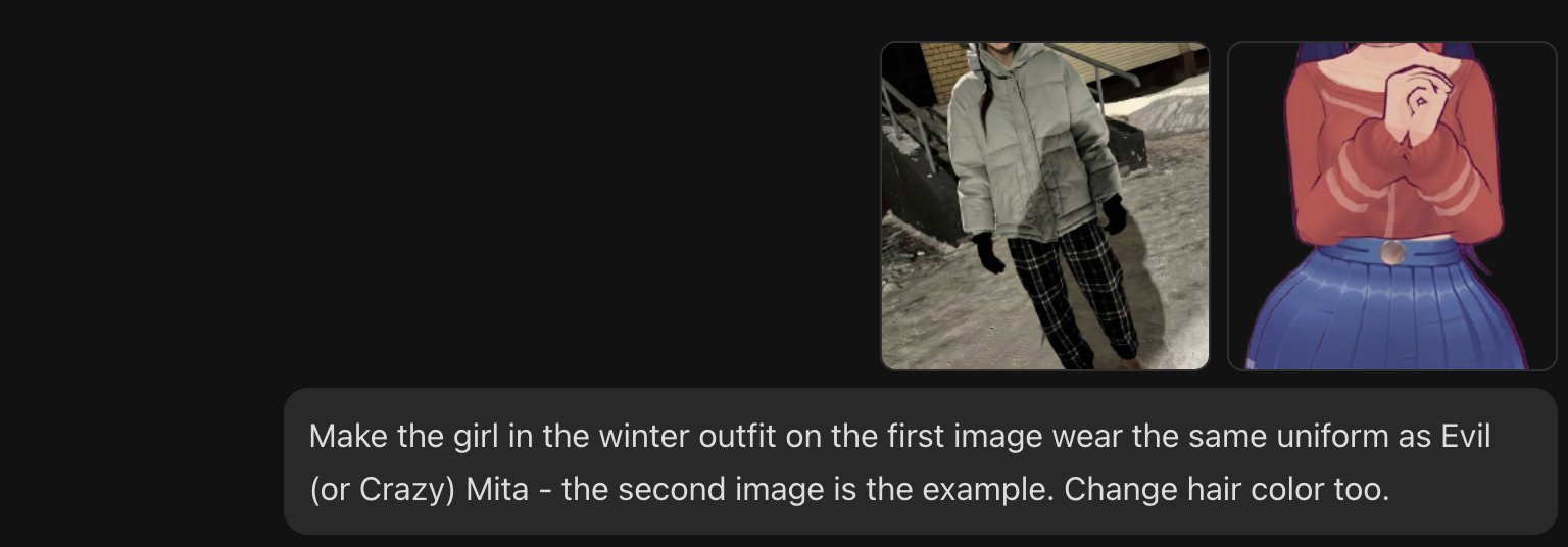 >>26169626 Да просто открой гугл, найди нужную пикчу - пкм - копировать. Заходишь в чат с ИИ - вставить. Вставил Анелечку, вставил вторую пикчу и пишешь типа: Поменяй первую пикчу (где тян в зимней одежде) так чтобы у тян поменялся прикид на тот что на второй пикче, но остались выражение лица, освещение, бэкграунд etc.