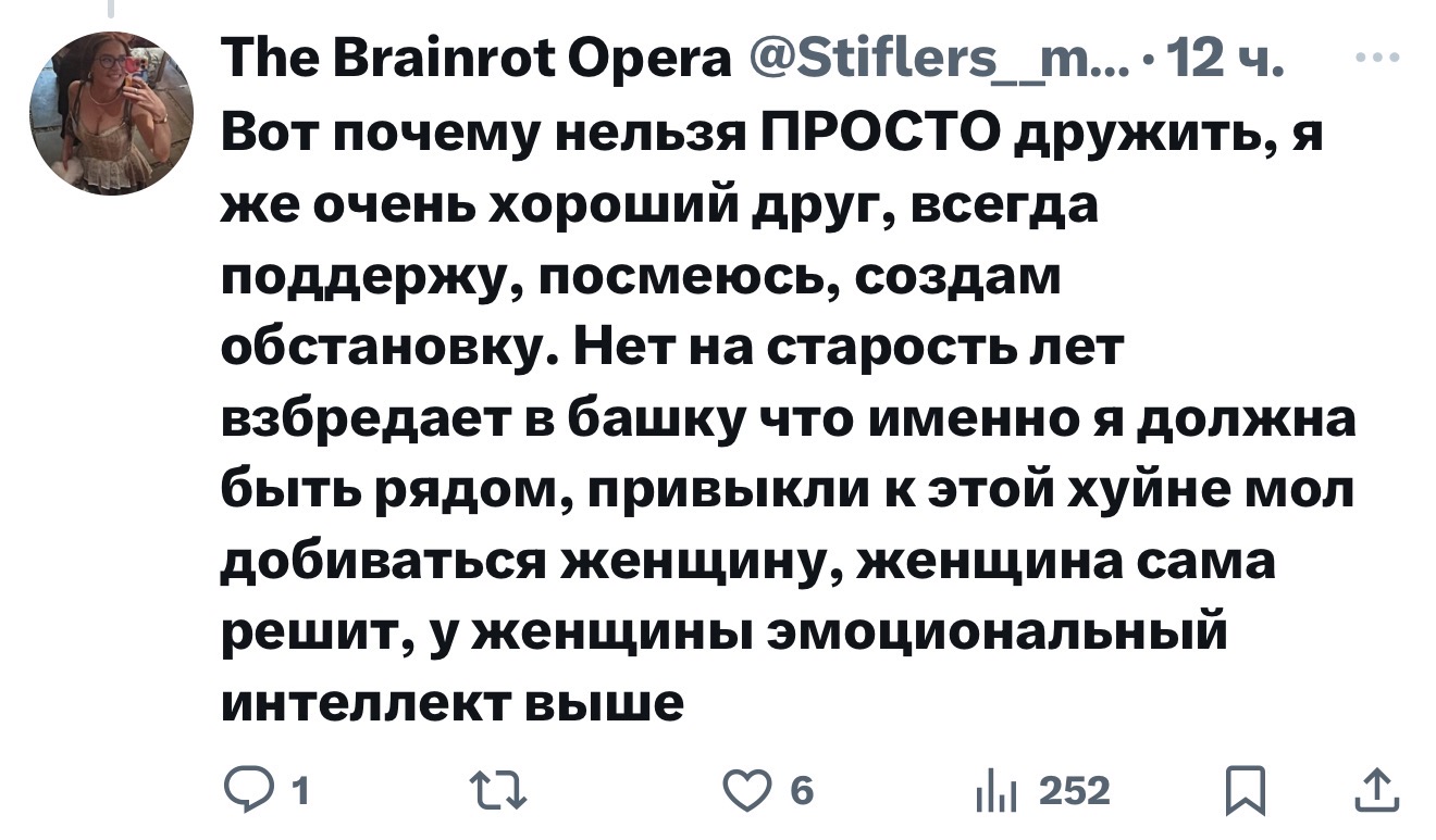 средний тестостерон у публики на уровне пердиков: ниже плинтуса. вместо реальных дел - обсасывание чужих пальчиков и куколд-видео, чисто эстрогеновый цирк. если б хоть раз кто-то вышел на улицу и не стримерствовал свою импотенцию, может и подскочил бы, а так ноль.