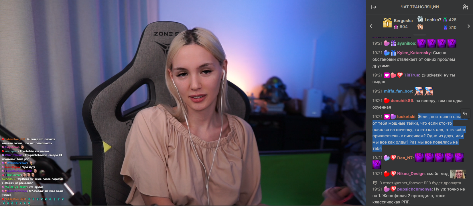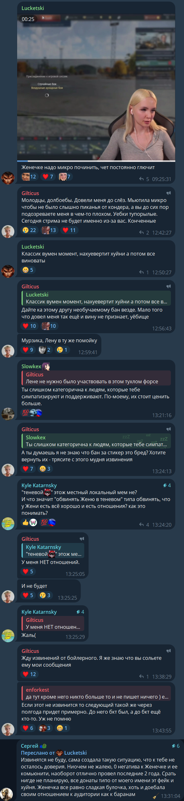 И ещё в подтверждении того что Женя и Фасоль находятся в состоянии холодной войны приведу это. На днях Ксюша на стриме смотрела всякие клипы стримеров. Ей попался клип с Женечкой где она примеряет на себя подарки, так там в чате такой галдеж начался! Как её только не оскорбляли, даже тут так не оскорбляли, а модераторы даже предупреждения никому не выдали, не то что не забанили. Это война.