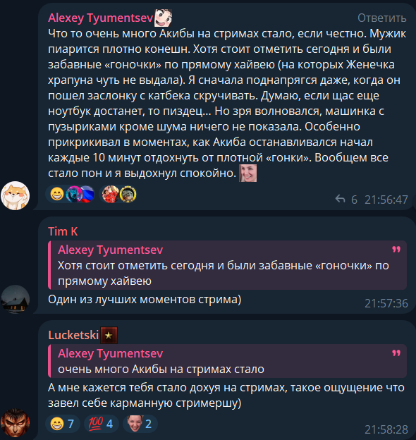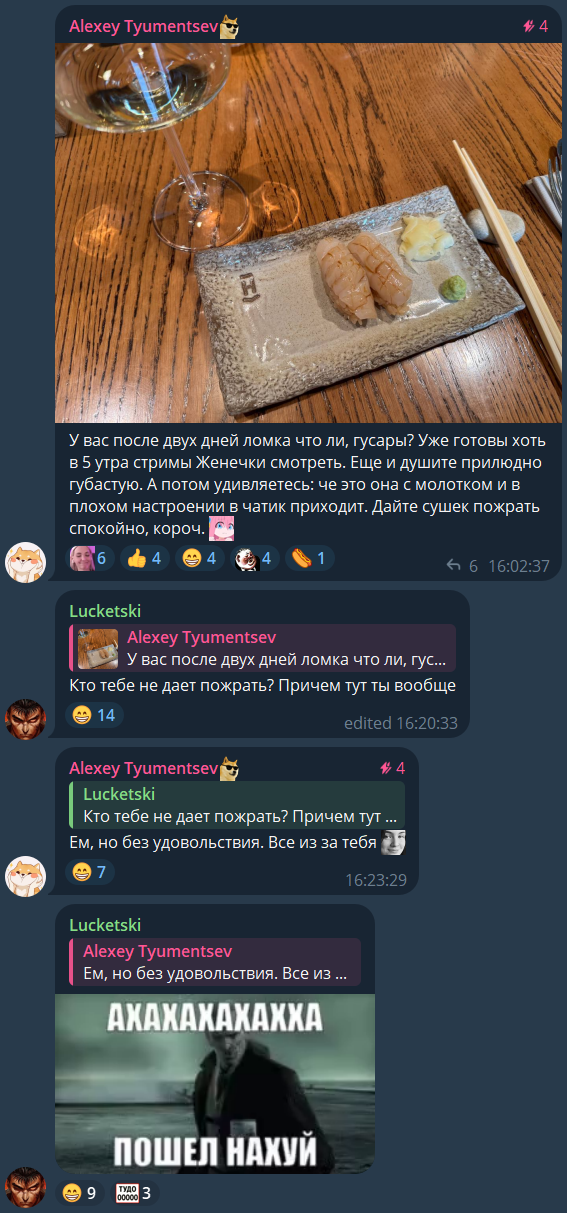 >>26184125 >>26184130 >>26184134 Из анализа представленных письменным источников следует, что у пациента Лакецкого имела место лютая биполярчка. Периоды любви и восхищения к Жене сменялись приступами ревности и самобичевания, а троллинг и подъебы - смиренными извинениями и крупными донатами. Как нам известно, в результате пациент не выдержал и сбежал, обвинив во всем стримериху. Но побег оказался фейковым, ведь всем известно, что ЖЕНЕЧКА НЕ ОТПУСКАЕТ, и Лакецкий продолжил наблюдать за любимкой, теперь тайком. Закончилось все крайне печально, - рассылкой той самой фотки с отсосом симпам в личку, что немедленно получило огласку и предало Лакецкому несмываемому позору, увы С тех самых пор его никто не видел...