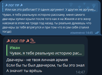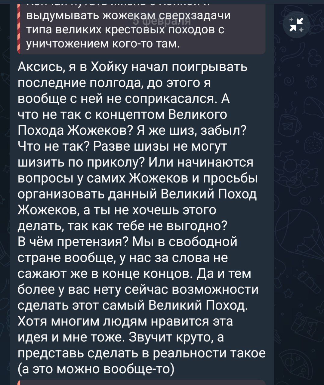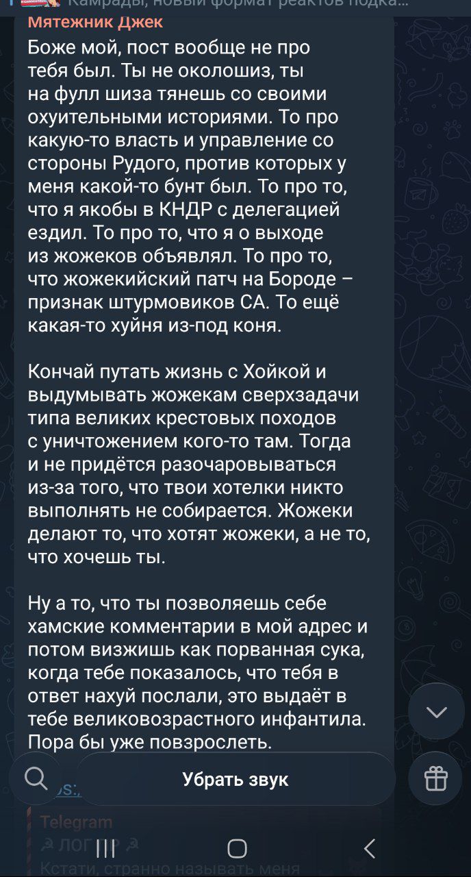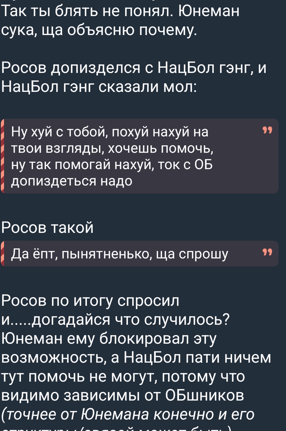 >Да, я союзник Росова, да я считаю, что этого чела нужно поддерживать вместо Юнемана. Я имею право на это во всяком случае, я свободный человек, я делаю ВЫБОР. Скорей фанатик. Союзник тот кто хочет сделать жизнь своего движа лучше. Тебе здесь пишут два человека минимум про ошибки Росова и почему Юнеман его не повезет в ЛДНР. Вместе того чтобы придумать как сделать поездку на Донбасс былью, ты кричишь в небо на Юнемана. По сути вот эти все претензии это просто standby mode на который тебя поставил Росов, начав свой открытый конфликт с Юнеманов. Он не допускает тебя до решения реального решения своих проблем или хотя бы не посвящает в свои планы на уровне хочет он туда ехать или нет.