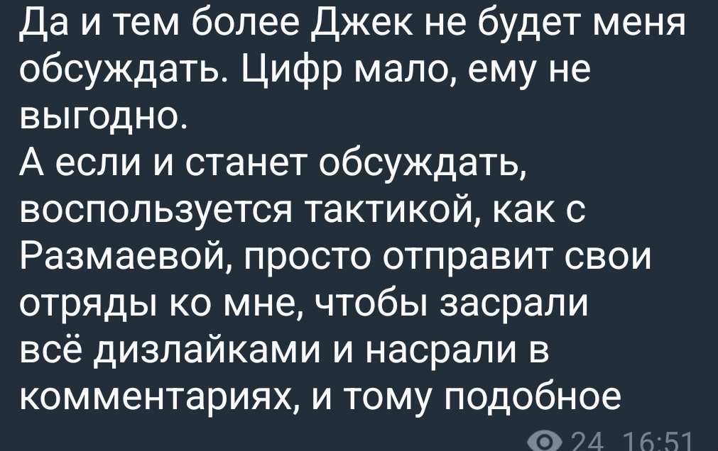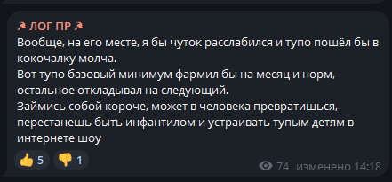 >Не хочу быть клоуном ради денег, как КопроЖмыль, прости, у меня самоуважение. Я лучше буду месяц впахивать ради этих денег, зато не ударю в грязь лицом Какое-то самоуничижение. Вариант достойно отстоять дебаты ты даже не рассматриваешь. Достчоно странно, что ты бахвалишься в ролике о своем одиноком походе, а как дело доходит до непосредственного разговора ты всегда уходишь в норку. Вот, ты в крайнем ролике говоришь, что против Юнемана нужно идти писать заявление в прокуратуру, чтобы его накуканить. Ты же знаешь, что заявителя могут привлечь за дачу ложных показаний, как минимум. То есть сознательно подставляешь своего потенциального союзника под ударам. Сам же не готов даже рисковать быть опозоренным в дебатах отстаивая свои идеи. Но давай так раз ты говоришь, что будешь работать, то целый месяц не проси деньги. Ни в паблик ТГК, ни в приватом. Честное выживание на ЗП. Сможешь так?