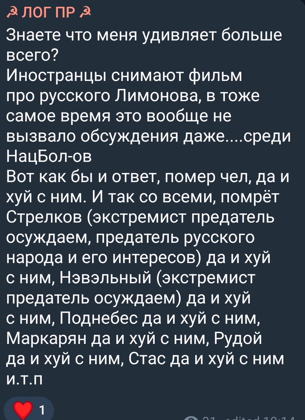> Эдуарда Лимонова Про этих я знаю, но я не понимаю что ты понимаешь под "нацболами" и их гуммантирными миссиями. В ТГ я нашел отчёты со сборов и работу с аптечками, а личных миссий от их организации нет. Росов получил официальный инвайт от другой России поехать с ними? Тот с кем он общался согласился взять его с собой покататься? Одна неразбериха