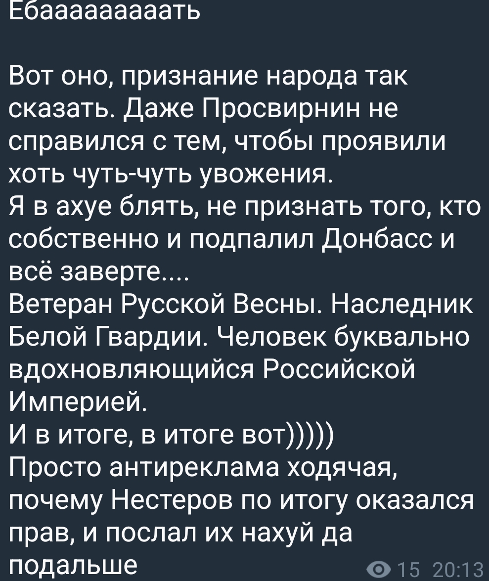 Причем здесь уважение и объективная реальность? Во время СВО Стрелков стал лолкав для либералов и хохлов, которые постоянно смотрели на его выступления и кайофали с этого. При этом Игорь Иваныч не дурак и сознательно завозил им все новые и новые перформансы. Ты можешь плакать сколько хочешь, но именно та прослойка новой аудитории дала ему миллион в телеграмме. >Нестеров по итогу оказался прав Девочка фанатка, тебе миллион раз говорили и даже в специальном выпуске подкаста русские вперёд проговорили. Нестеров, как литературный хохол стал визжать на русских после встречи с ополченцами русской весны куда его повел Погром. >Абсолютно лицемерны, без мозгов и даже не знают, что сделал Стрелков в 14-ом году Нетупой, в каком веке крестили Русь?