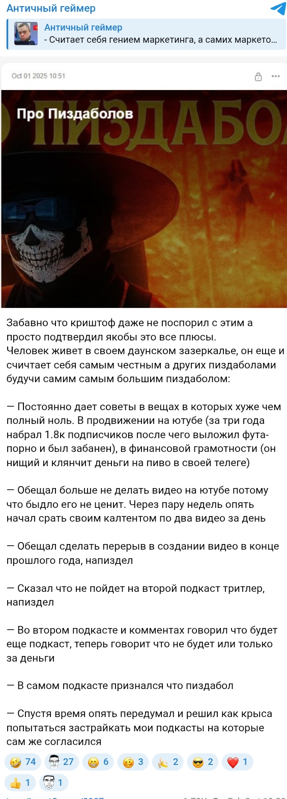 Сегодня Криштоф что-то совсем поплохел. Несёт какой-то бред в канальчике про то что не хочет позориться, в открытую отказывается от денег, зациклился на говне. Сложилось ощущение что Криштоф больной человек. Я не с самого начала слежу за войной но теперь всё больше убеждаюсь что Криштоф не более чем объект насмешек. Античный Геймер, Ретрофор, Ланчебосс и все остальные сидят в одной конфе и просто хихикают с Криштофа со всех его сливов, тупых тейков, деанонов. Мы свидетели как прилюдно популярные блогеры унижают больного на голову Криштофа