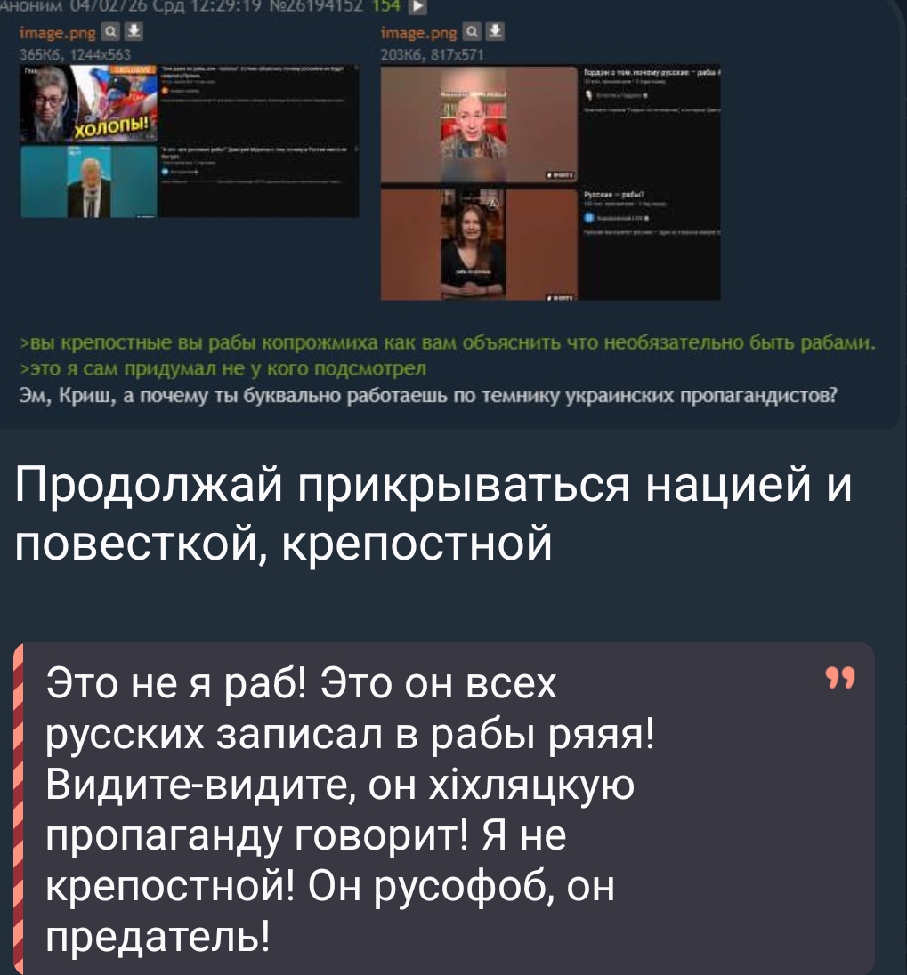 >вы крепостные вы рабы копрожмиха как вам объяснить что необязательно быть рабами. >это я сам придумал не у кого подсмотрел Эм, Криш, а почему ты буквально работаешь по темнику украинских пропагандистов?
