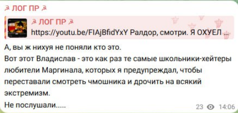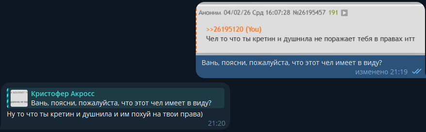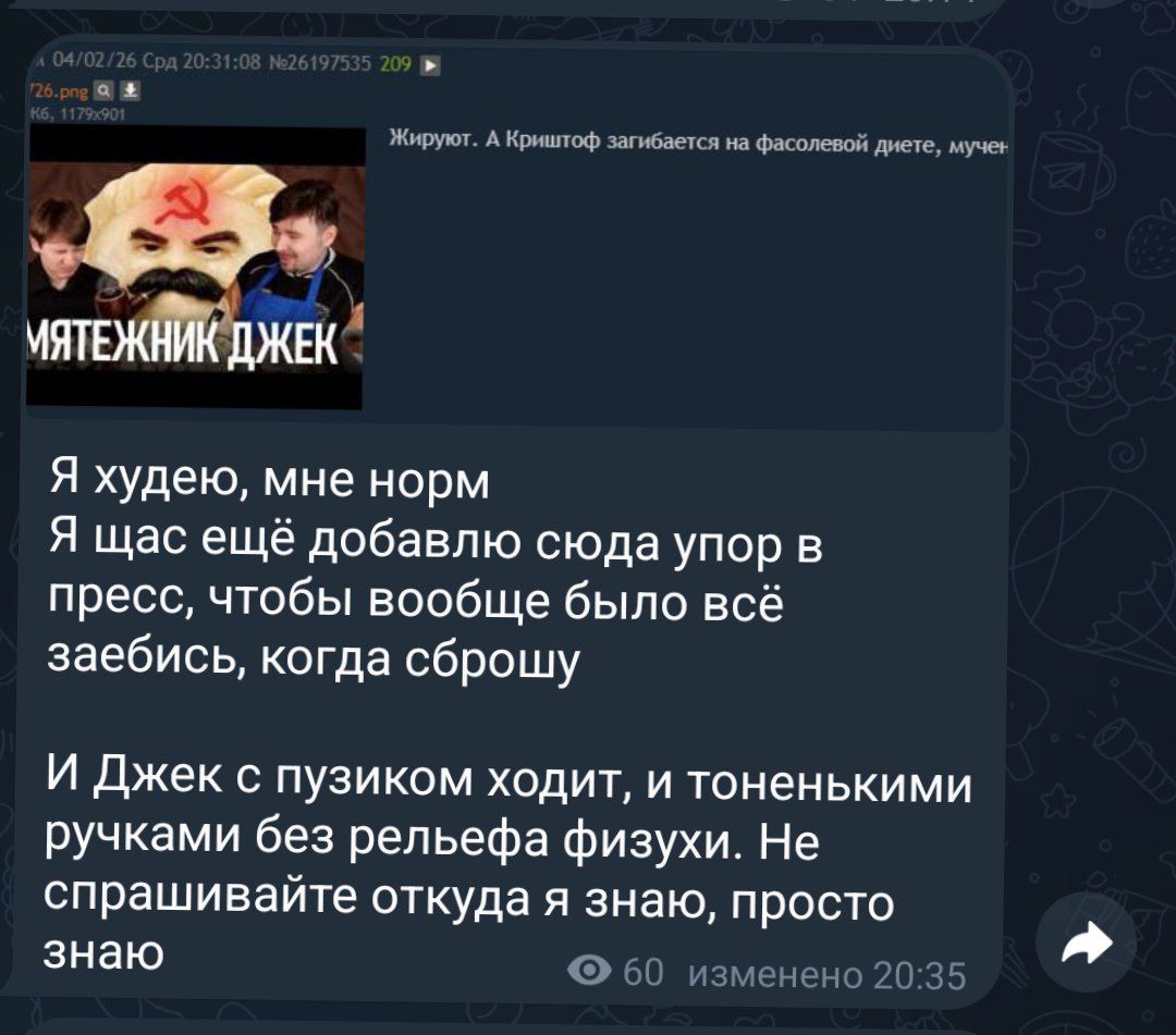 >чтобы он не действовал на неокрепшие умы, и не подводил людей под статью Дурак, ты громче всех и подводил его под статью. Ты буквально каждый раз писал в своем ТГК, что он донатил террористам из рдк. Можно предположить, что это написал на него донос. Пару тредов назад ты так же обещал, что напишешь куда надо и педофила Ретрофора просто увезут. Молодец Криштоф
