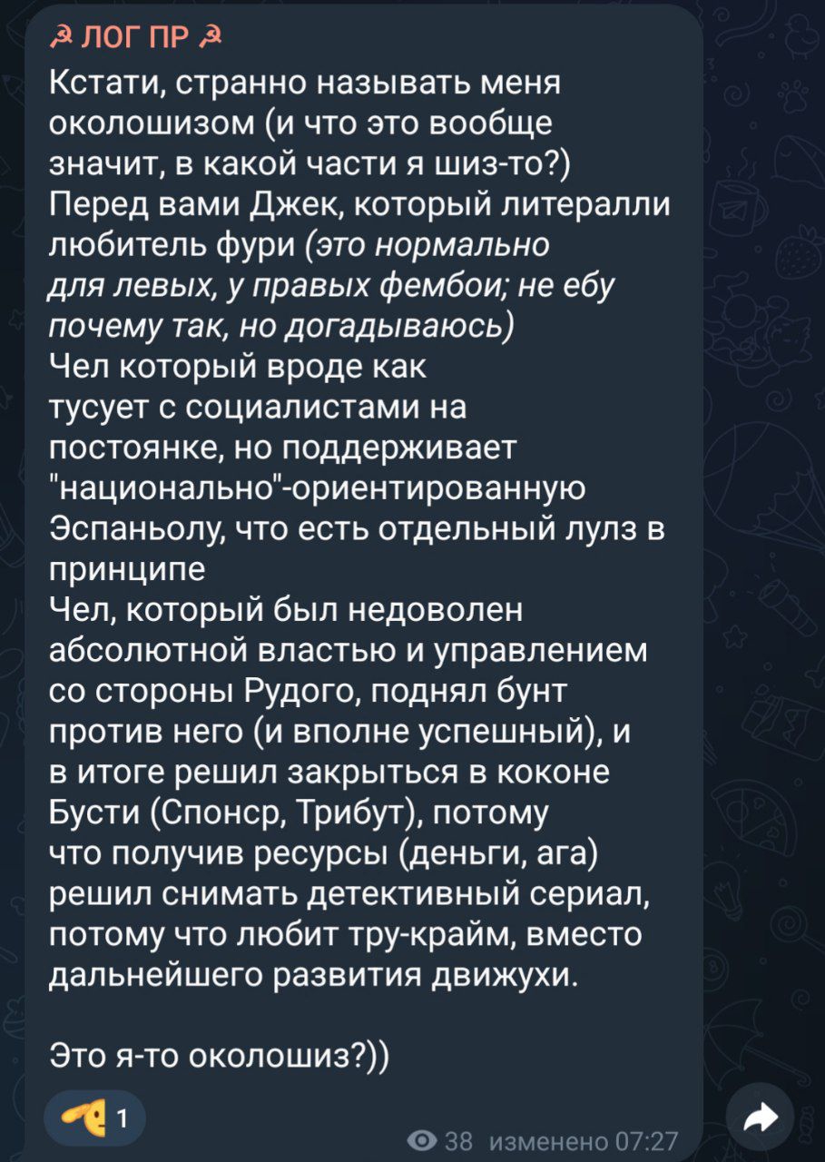 Вы тоже заметили как криштоф не пишет в тред но обсуждает его у себя в тгк? С одной стороны хочет своего внимания а с другой боится плохих вопросов и того что он опять не сдюжит спорить. Ой ой Криштоф удобно лаять из своего канальчика. У людей к тебе столько вопросов а ты продолжаешь закрываться в своём сейфспейсе. Ты хуже и юнемана и федосеева и любых чинуш. Они хотя бы что-то делают. А ты только хочешь чужих денег и уходишь от вопросов. Ай ай Криштоф нехорошо