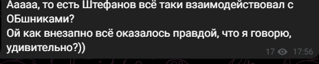>Штефанов получал "благословение" Юнемана и через их гум.миссию поехал на Донбасс. Ты читаешь что я пишу? Штефанов купил им обогреватель и поехал туда внутри волонтёрской миссии, так же он в Белгород гонял "гуманитарить", но ты делаешь вид что этого не было. Лично никто из ОБ камеру ему не таскал и людей для видоса не искали. Росов на таких же условиях мог сгонять туда до того, как получил иноагента. То что ты просишь это полноценный пресс-тур для Носова, где он в качестве главной звезды будет кататься по ЛДНР под флагами ОБ и раздавать гуманитарку под камерами.