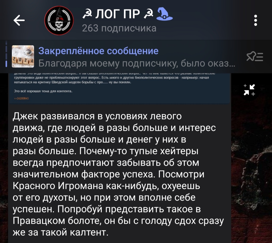 Сабж умудрился за рекордно короткое время прокатиться по всему подвалу рунета, одновременно обсуждая и красных, и правых, и в процессе случайно добился самовыпила собственных каналов на Ютубчике. Причина классическая — фута-контент, за что его в итоге аккуратно вынесли с ру-ютуба, но это не точно. Дальше всё по учебнику, как полагается каждой микро-селебе из околополитического болота, завёл личный шизо-чатик в телеге. Там он круглосуточно заливает поток сознания — от нытья про тян (с акцентом на вечную драму с бывшей Данилинга) до тяжёлой геополитической шизы про будущее России. В довесок приплетает андеграундные кружки уровня Светова, Юнемана и прочих Жожеков, чтобы выглядело солидно. Преподносит себя так, будто у него аудитория на пару сотен тысяч и его мнение весит хотя бы что-то (спойлер: нет). Но, внезапно, вызывает неподдельный интерес публики, будто у него есть какой-то тёмный лор и политическая тусовка Ютуба реально в курсе, кто он такой, просто молчит.