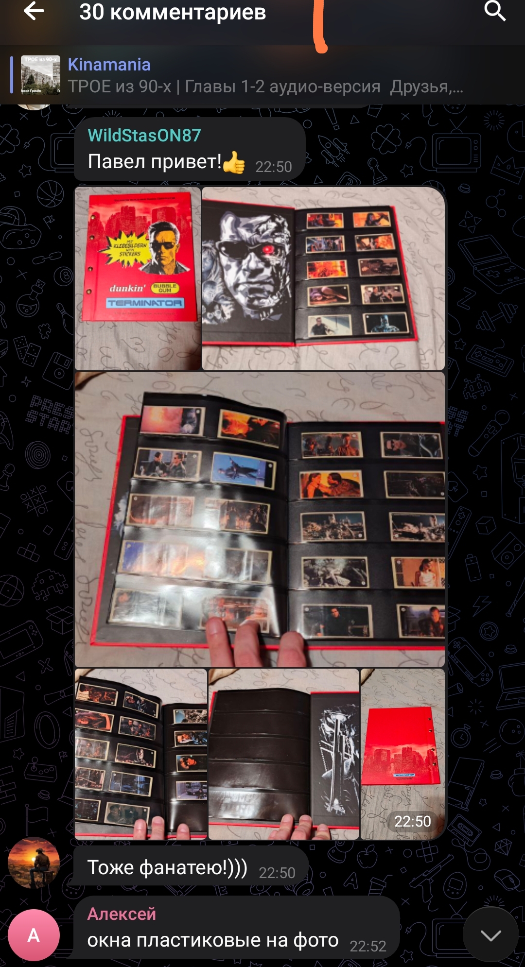 [00:00:34] ### Глава первая. Тайна двадцатого номера Три мальчика — Сашка, Юрка и Андрей — спорят о загадочном изображении на наклейке из серии стикеров к фильму «Терминатор 2: Судный день». Спор касается личности мужчины, изображённого рядом с Сарой Конор на двадцатом номере наклейки. Мнения разделились: один утверждает, что это муж Сары, другой — что это полицейский или бомж из сцены в гараже, третий — что это Т-1000, жидкий металл из фильма. Спор почти перерастает в драку, и вмешивается третий мальчик, раскрывая, что это — жидкий металл (Т-1000).