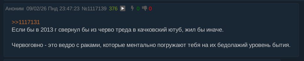 >>26242965 >>26242968 Это долгая история, новый. Всё началось когда сюда в 2024 пришло 4мо. 4мо начало срать в тред Вовиком, на тот момент уже давно неактуальным персонажем. Поначалу Вовиком сралось слегка, потом сильнее, потом пошли пылесосы, спермочки, смегмочки и т.д. Все надеялись, что 4мо перебесится, поэтому терпели. Но в начале 2025 4мо решило что может устанавливать в треде свои порядки. И сделало роковую ошибку, захотев удалить из треда Яну потому что она твиттерная. И Хомяка тоже, потому что твиттерный. Так в феврале. когда 4мо окончательно заебало всех, начались твиттерные войны. По итогам 4мо проиграло, Яну вернули в тред, Хомяка тоже, в мае Хомяка даже избрали талисманом треда (скорее всего просто назло 4му, но это неважно). Но поражение не угомонило 4ма. 4мо даже создало свой червач и даже увело туда некоторых подсосов, но посещаемость червача была мала, и 4мо вернулось сюда, чтобы снова срать Вовиком, вандалить треды и т.п. Вследствие этого в ноябре 2025 было проведено голосование по запрету Вовика в треде, которое 4мо снова проиграло. Всё.