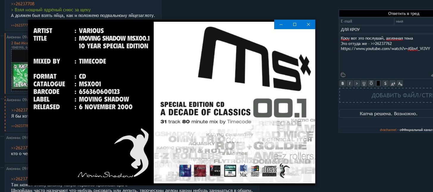 >>26237922 moving shadow вообще топовый лейбл. а omni trio один из моих любимых джангл, интилиджент днб проектов. знаете иногда задумываюсь, почему у нас в ретро движе так мало любителей электронной музыки? сплош рокеры, говнари, металюги.