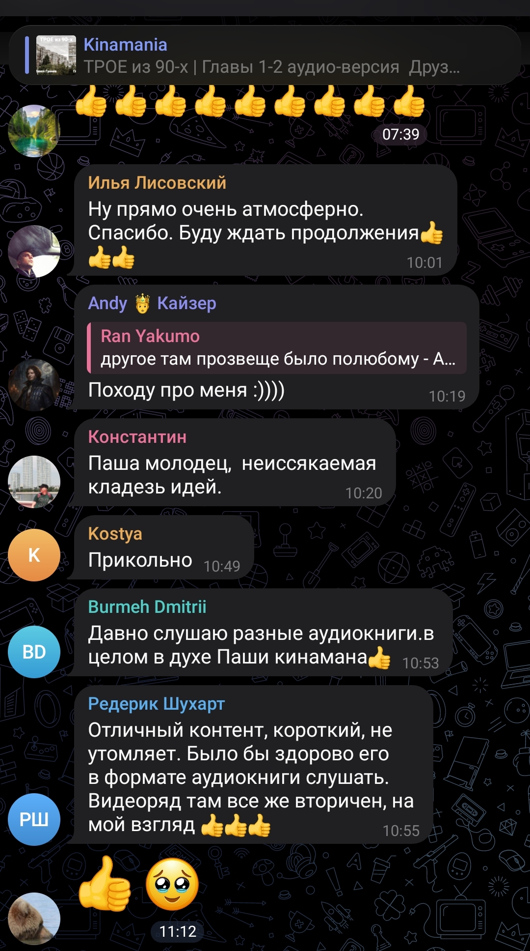 Вы как хотите, а я всё-таки послушаю. Вдруг там какие-то зашифрованные послания. Например "я спрятал часть своих миллионов по адресу..." Паша творческий человек, креативный, вполне мог так сделать. Чтоб только самые верные кинамановцы поняли и получили свой приз.