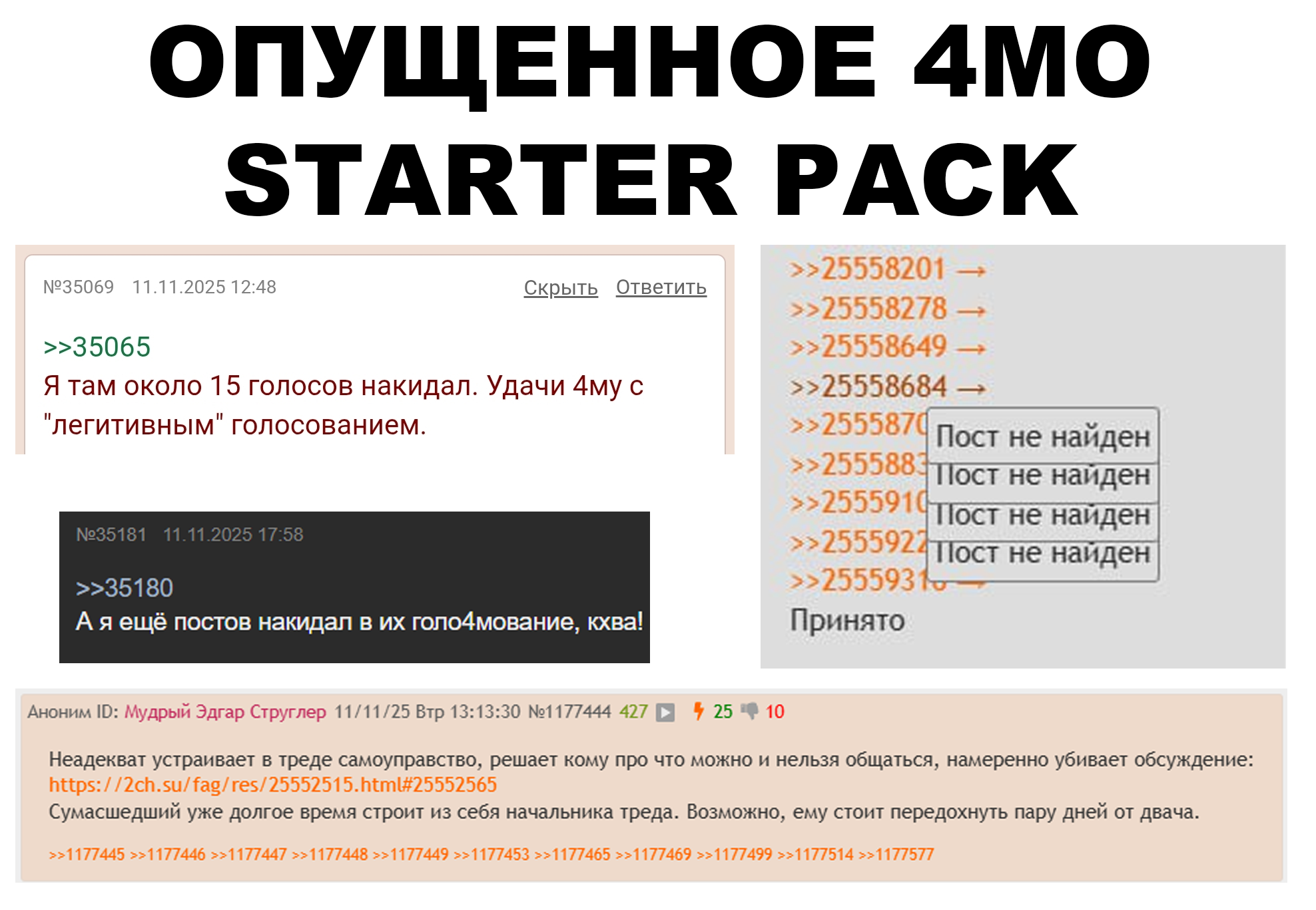 Всё началось когда сюда в 2024 пришло 4мо. 4мо начало срать в тред Вовиком, на тот момент уже давно неактуальным персонажем. Поначалу Вовиком сралось слегка, потом сильнее, потом пошли пылесосы, спермочки, смегмочки и т.д. Все надеялись, что 4мо перебесится, поэтому терпели. Но в начале 2025 4мо решило что может устанавливать в треде свои порядки. И сделало роковую ошибку, захотев удалить из треда Яну потому что она твиттерная. И Хомяка тоже, потому что твиттерный. Так в феврале. когда 4мо окончательно заебало всех, начались твиттерные войны. По итогам 4мо проиграло, Яну вернули в тред, Хомяка тоже, в мае Хомяка даже избрали талисманом треда (скорее всего просто назло 4му, но это неважно). Но поражение не угомонило 4ма. 4мо даже создало свой червач и даже увело туда некоторых подсосов, но посещаемость червача была мала, и 4мо вернулось сюда, чтобы снова срать Вовиком, вандалить треды и т.п. Вследствие этого в ноябре 2025 было проведено голосование по запрету Вовика в треде, которое 4мо снова проиграло. Всё.