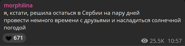 А кто-то понял мув Вадима с тем что б оставить Морфилину в Сербию? Просто показалось,что он сделал просто блять что б сделать и всё.Максимум для стримов Роме,себе он явно ничего с ней вдвоём или типо того делать не будет,отношения никакие так же не нужны ему с ней