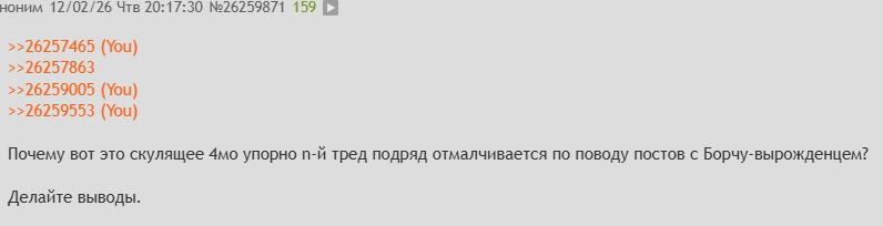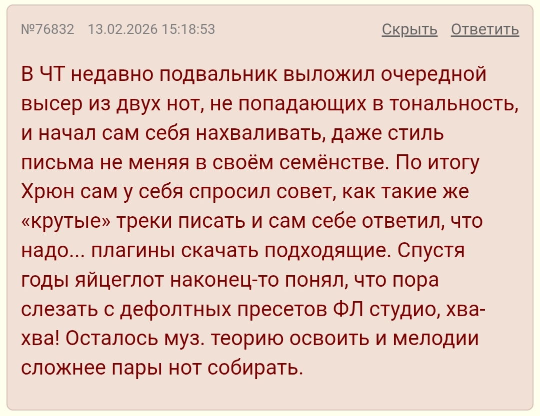 >>26263628 Спасибо тебе за разъяснение, знаток культуры степных неандертальцев, очень познавательно. >>26263586 >топит за ЧТ старого образца Нет, я лишь прошу не засерать тред нелегетимным калом - только и всего. Никаких проблем, если иногда по ситуации, в контексте легитимного чоса и в умеренной дозировке проскакивает нерилейтед, без этого в принципе чесать практически невозможно. Проблема, если начинается злонамеренное вредительство через перефорс такого нерилейтеда, как было с Гомяком и вот сейчас как бы назло какой-то шиз спамит то зумерским рэпом, то тик-токерскими кривляками олигофренами. Это не новый ЧТ, это испорченный, загаженный ЧТ. Постарайся увидеть и понять разницу пожалуйста.