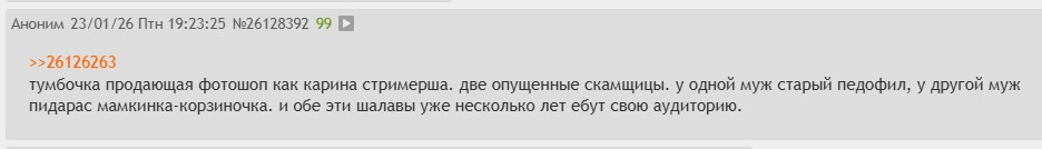 >Ну за последние 3 месяца 20 человек прибавилось Если ты про число подписчиков под аватаркой профиля, то это бесплатные подписчики, они ни на что не влияют и 20 подписчиков за три месяца это не то что крохи, это ноль (вон взять ту же Морана Баттори, которая на бусти год нихуя не заливала и у неё подписоты втрое больше, и это при том, что Морана медийный труп уже как года 3-4. У нонейм Вики Меднис которая вообще никто в медийке и никогда не была кем-то, которая подрубает раз месяц разговорный стрим на твиче подписоты в 6 раз больше. Про оляшу с её 16к подписоты и говорить не надо). Платных видит только сама Карина. Я сужу по реакциям на постах о платной подписоте и реакций поубавилось, поэтому думаю всё-таки отписки есть и поделом гниде. Т.к. онлик закрыт, глянул на бусти - у неё за полтора месяца 2026года т.е. почти за 50 дней всего 17 фоток вышло, а я напомню описание её бусти.