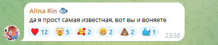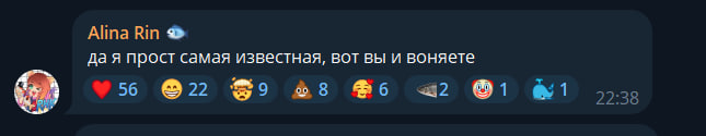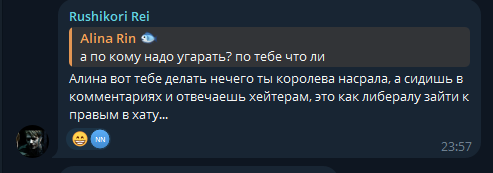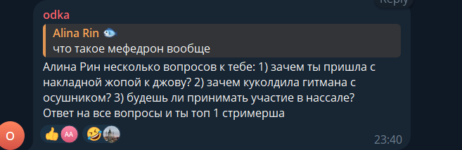 Жопич попросил свою аудиторию дать топ мерзких стримерш и там все комменты в Алине Рин. Она буквально через МИНУТУ припёрлась в комменты воевать за свою честь, и типа "попускать" аудиторию жопича. ахахахахах